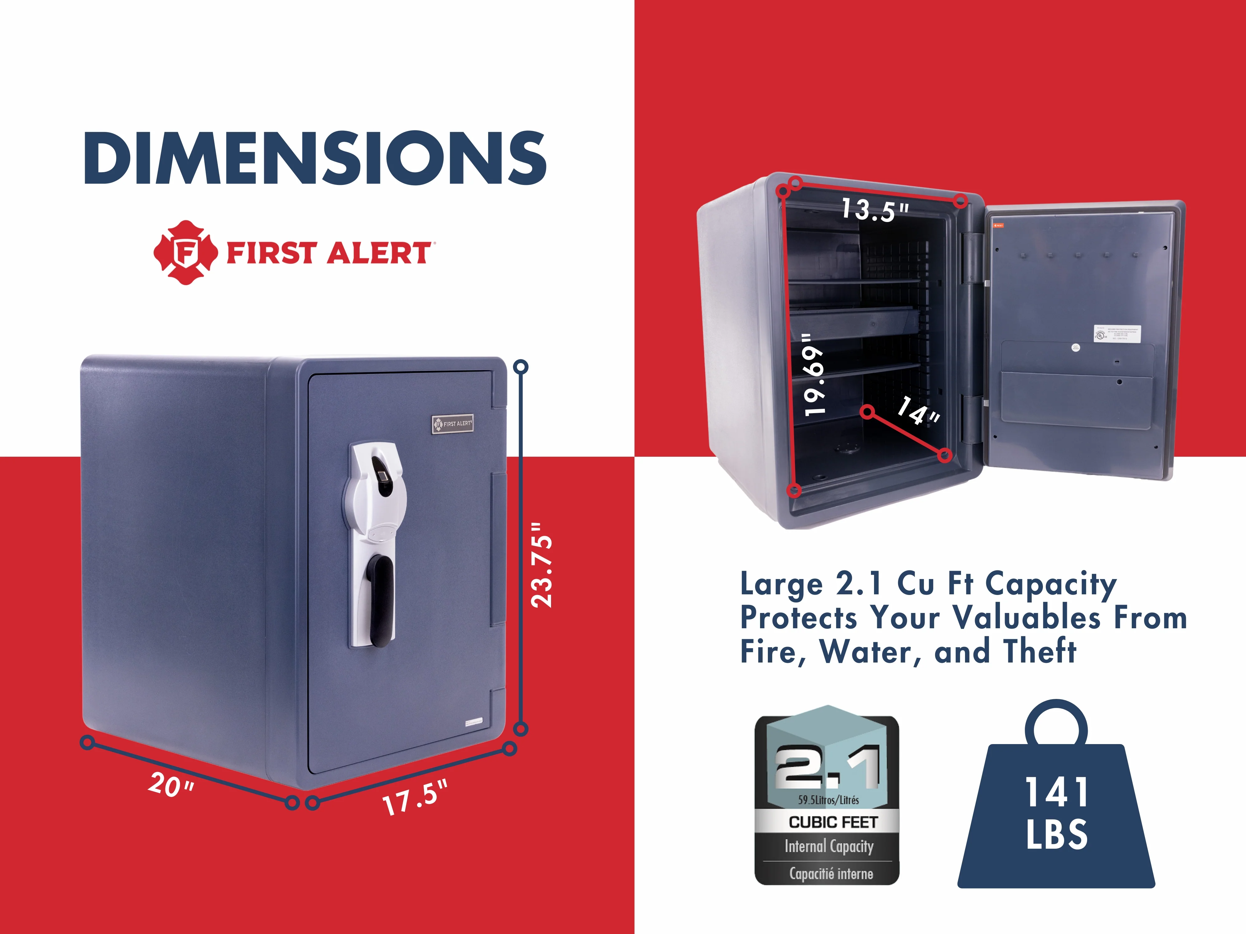 Help safeguard your valuables against theft, water and fire with the First Alert 2096LBF Waterproof and Fire-Resistant Biometric Fingerprint Safe. Featuring a capacity of 2.1 cubic feet, this waterproof and fire resistant safe offers enough space for money, electronics and other valuables.