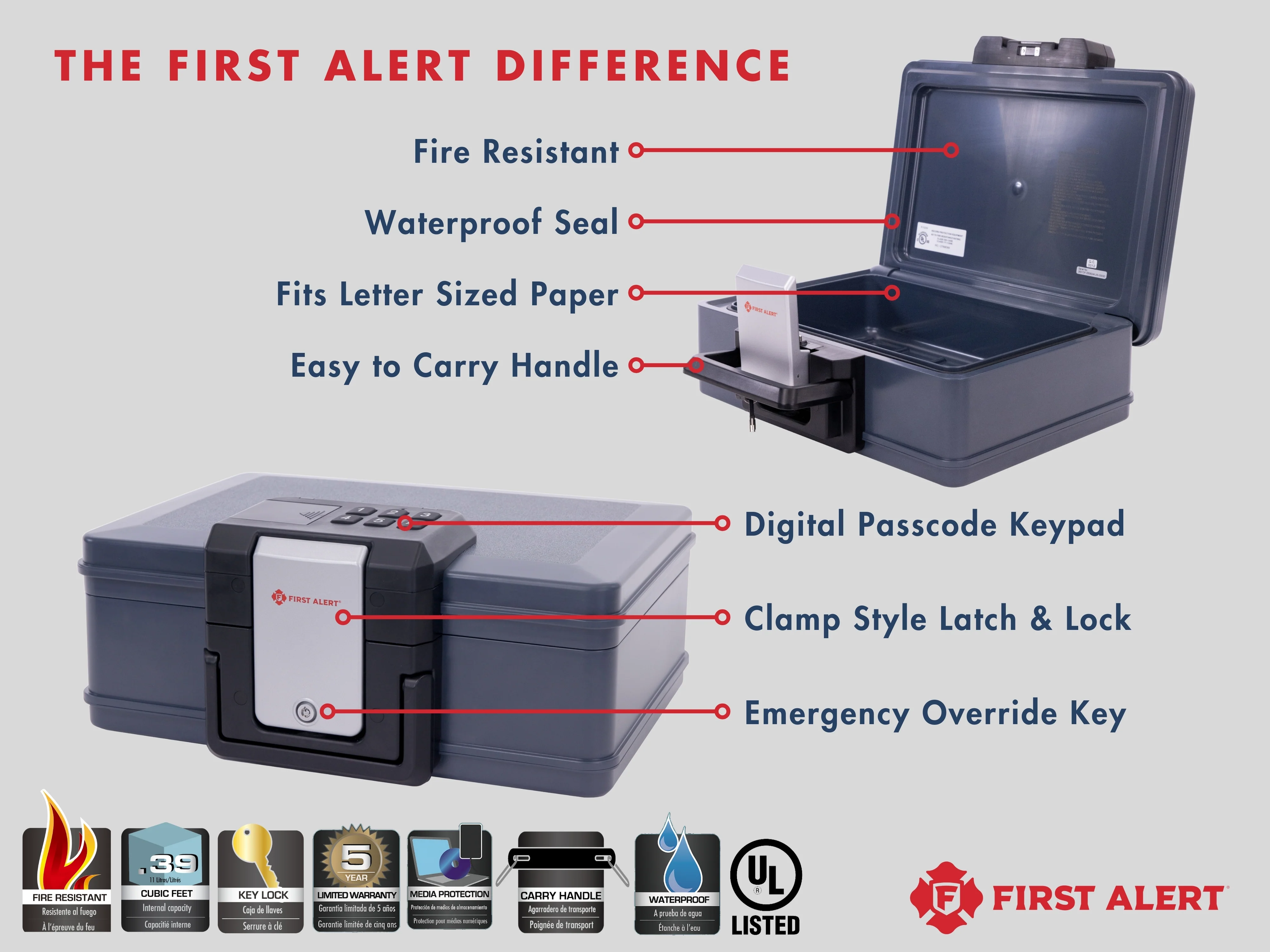 First Alert Fireproof and Waterproof Security Safe, .19 CU FT, 30 Minute Fire rating @ 1550, Fire Proof UL Rated Fire Chest. Features Digital Lock & Emergency Access Override Key. Model 2601DF