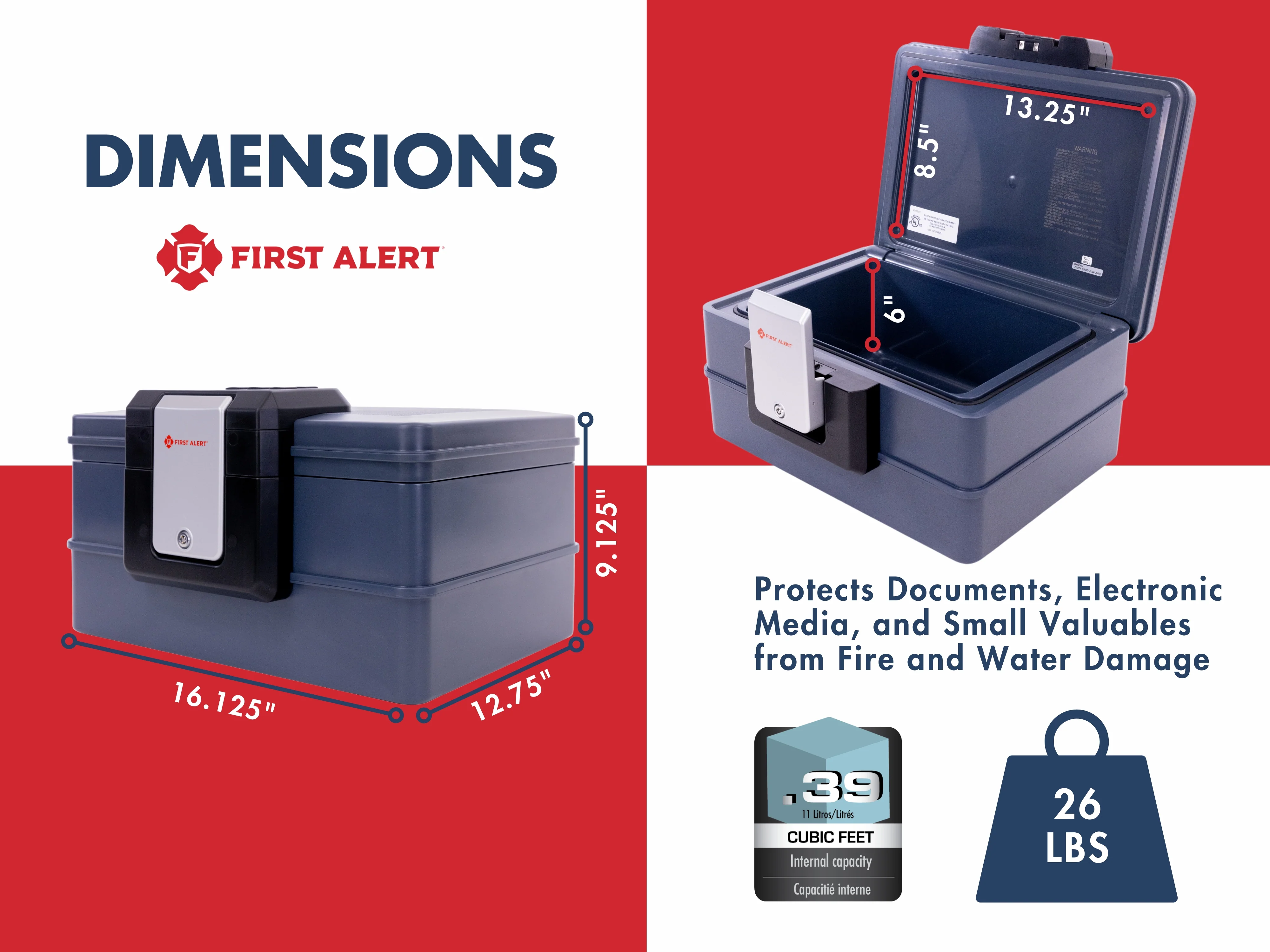 First Alert Fireproof and Waterproof Security Safe, .39 CU FT, 30 Minute Fire rating @ 1550, Fire Proof UL Rated Fire Chest. Features Digital Lock & Emergency Access Override Key. Model 2602DF