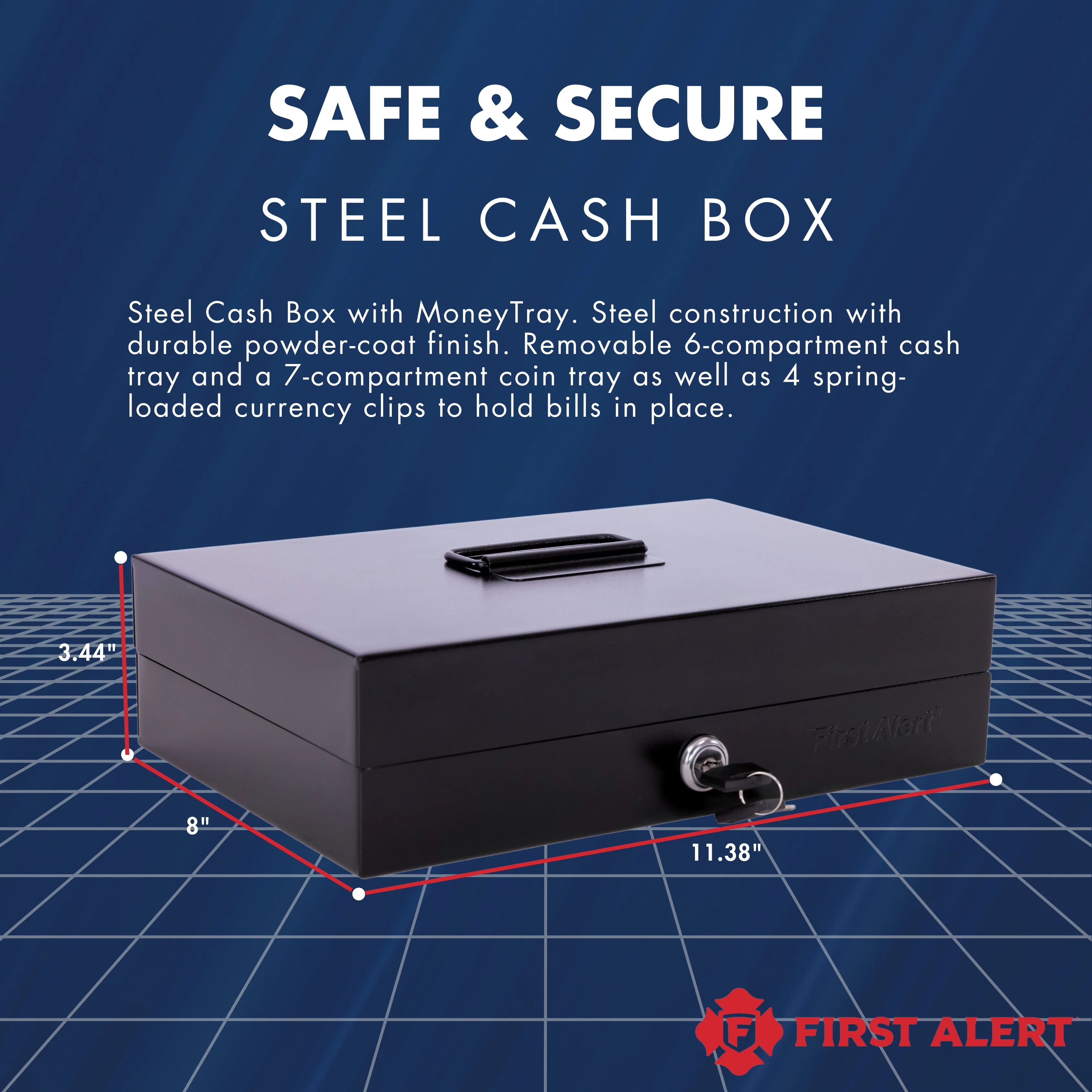 First Alert Locking Cash Security Box, made from 18 gauge powder coated steel. Comes with Removable 7 compartment cash tray and 4 spring loaded money clips. Model 3026F