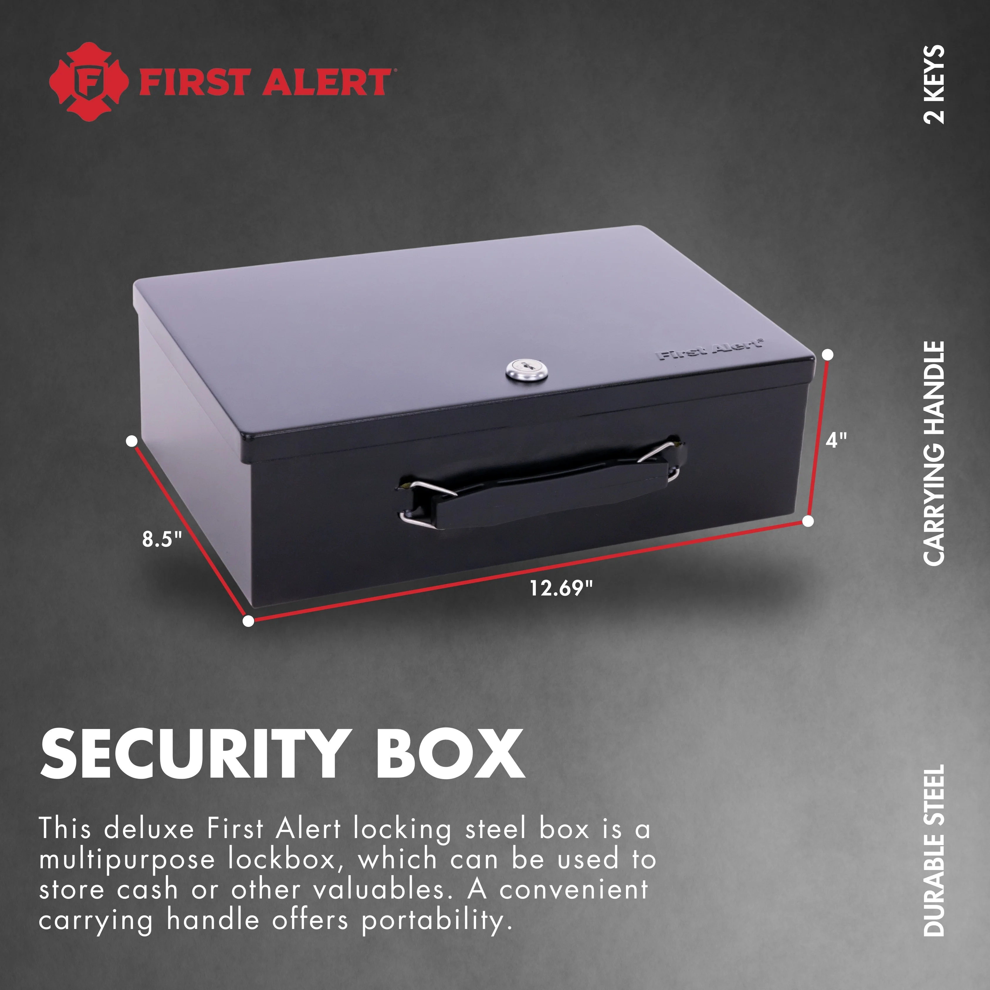 First Alert locking Fire Retardent Cash Security Box, made from powder coated steel, Double steel wall construction and interior lining. Model 3031F